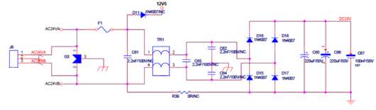 2: 針對此AC24V電源方案,由于其采用了DC-DC芯片轉(zhuǎn)換,所以整流橋負(fù)極性的地與后極數(shù)字地是必須相連的,這與FlyBack電路不同,所以其防護設(shè)計需要特別考慮從數(shù)字地通過整流橋到接口的路徑。