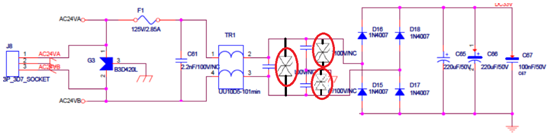 更改電路,由于原PCB空間限制,實際電路選用了檳城BV-SMBJ58C2H,SMB封裝,功率達(dá)到3000W,相當(dāng)于BV-SMDJ58CA。測試?yán)讚鬉C24V電源口AC24VA測試通過,AC24VB測試后設(shè)備損壞,詳細(xì)檢查電路后發(fā)現(xiàn)整流橋二極管燒毀。