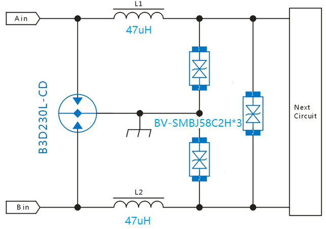 共模電感后極增加TVS管做二級保護,TVS選型可以用BV-SMCJ58CA,BV-SMDJ58CA,BV-5SMDJ58CA,實際選用功率大小與PTC、共模電感退耦有關(guān)系。