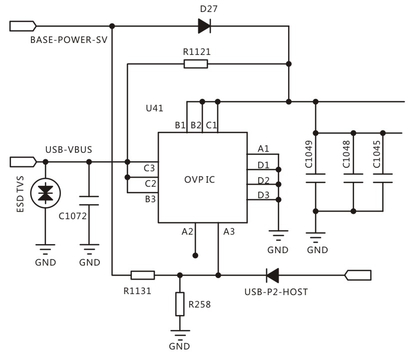 產(chǎn)品電路圖如下(原電路圖),該USB接口輸入端有三級(jí)防護(hù),初級(jí)是一個(gè)ESD類的防護(hù)器件,后級(jí)還有一個(gè)OVP防護(hù)器件,兩級(jí)之間沒有做退耦器件。查相關(guān)規(guī)格書,OVP的通流較小,為5A。前級(jí)ESD通流相對(duì)較大點(diǎn),為100W,折算成8/20μs的電流,約為13A左右。