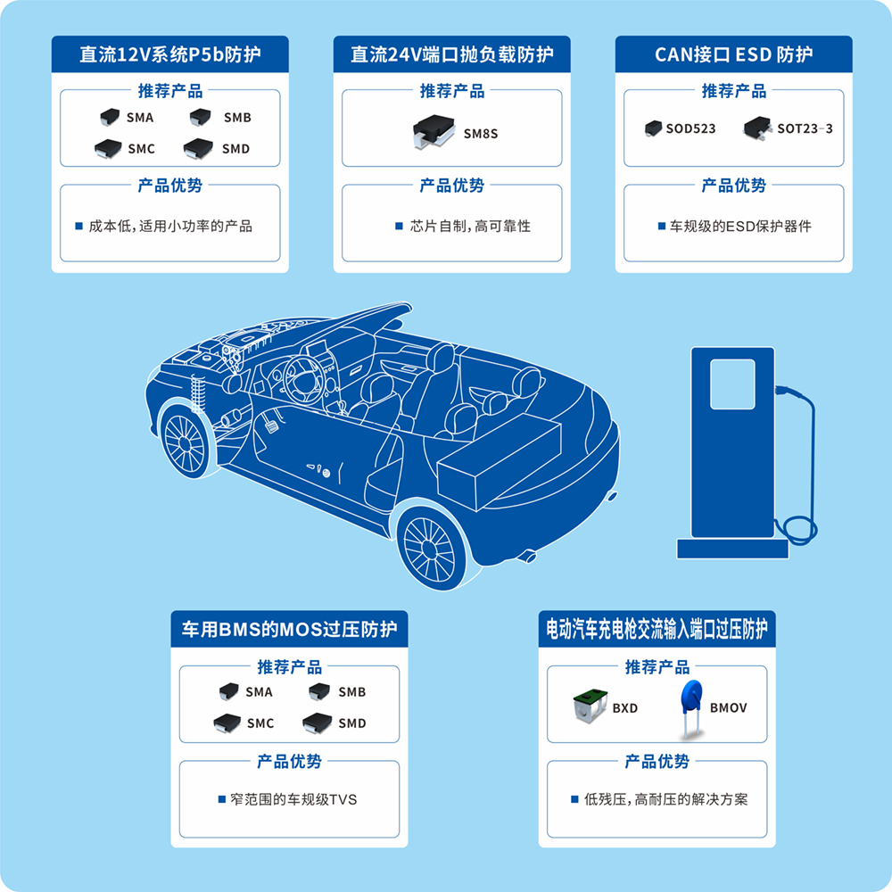 ▼看點(diǎn)二:汽車電子BMS、直流24V、直流12V、CAN接口、充電槍交流等防護(hù)解決方案