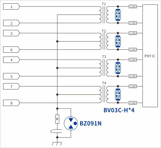 網(wǎng)口防護(hù)電路大致如(圖1),客戶初級(jí)側(cè)共模浪涌采用90V的GDT——BZ091N,次級(jí)采用低容BV03C-H做差模防護(hù),抑制浪涌或ESD電壓尖峰。
